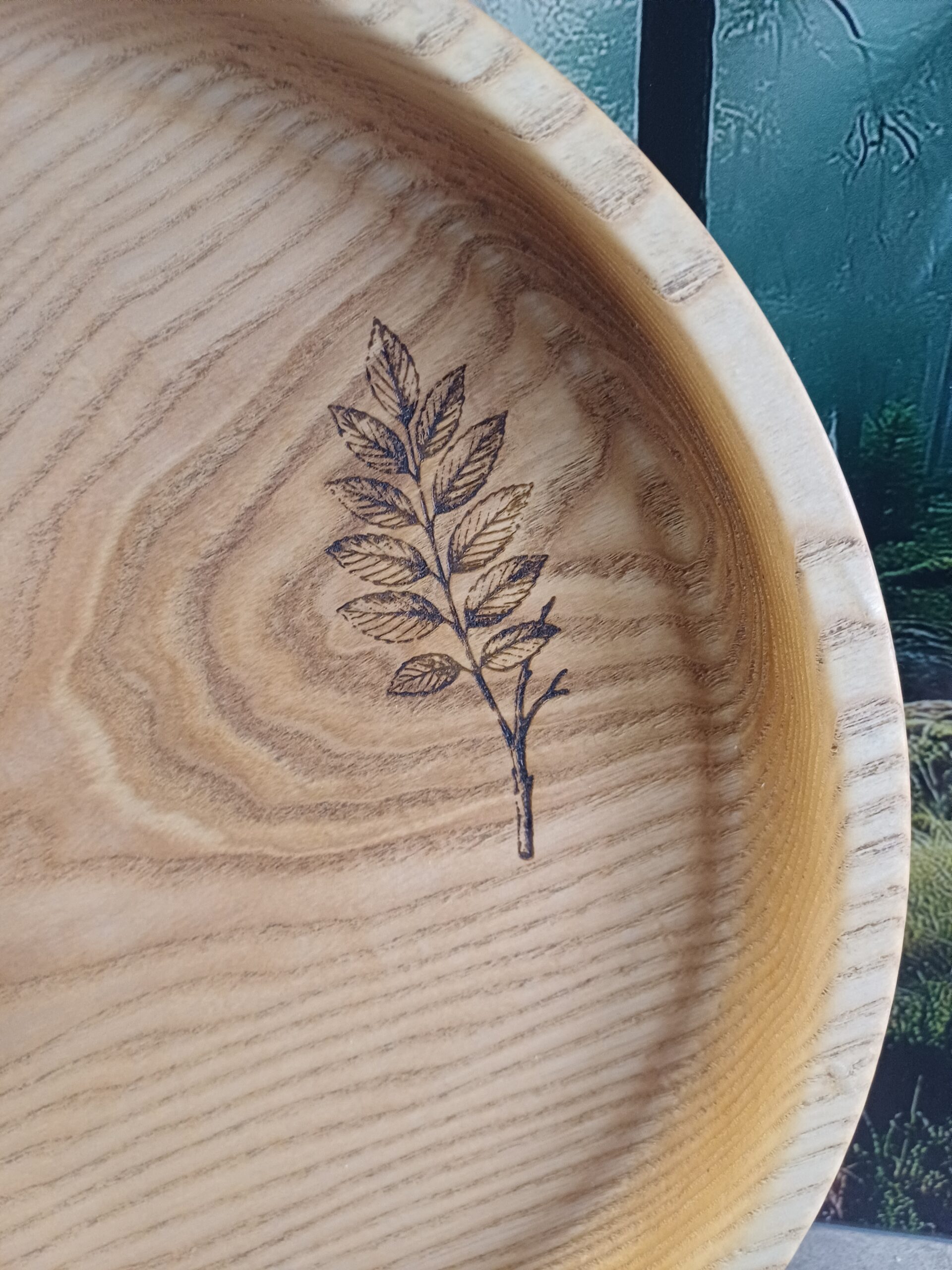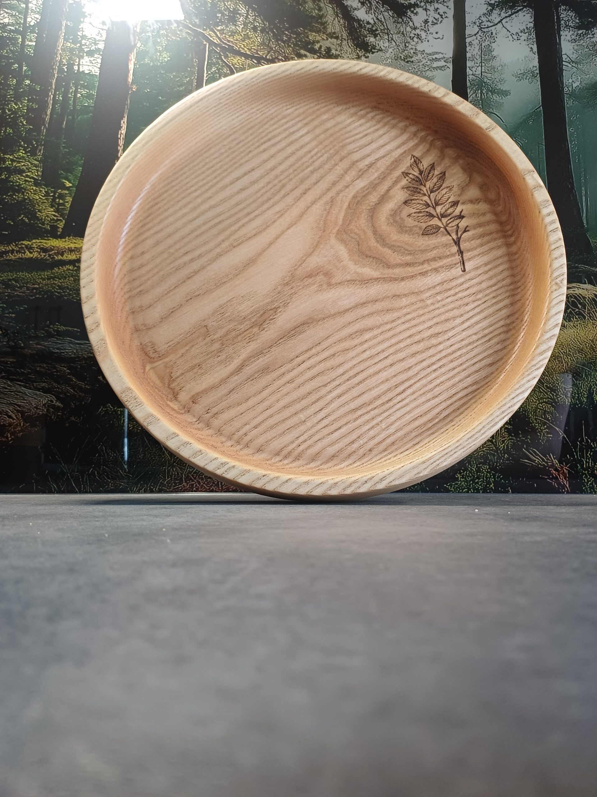 Na powierzchni patery wykonano subtelny grawer liścia jesionu, który nawiązuje do drewna użytego do jej wykonania i stanowi spójny, dekoracyjny detal.