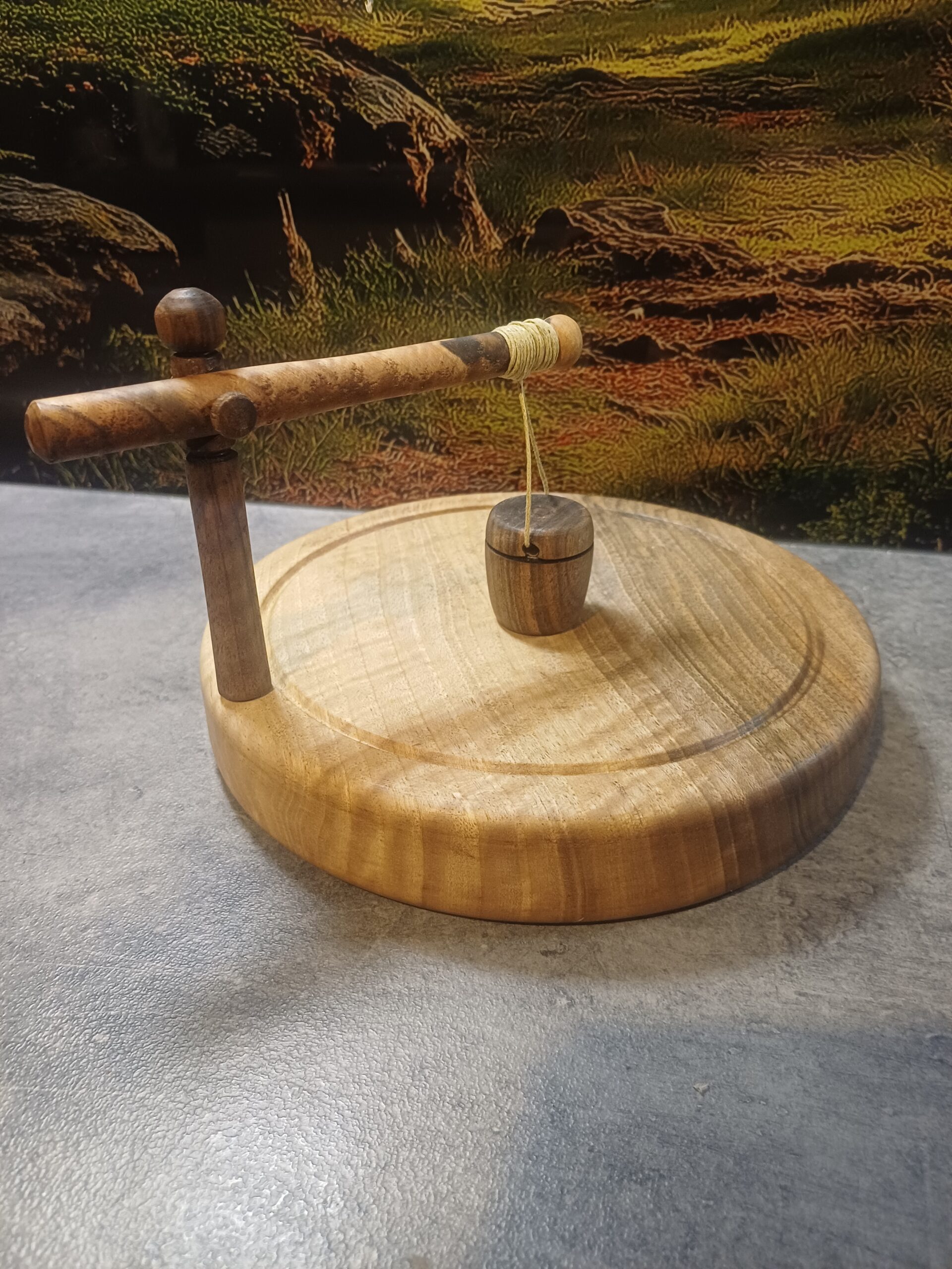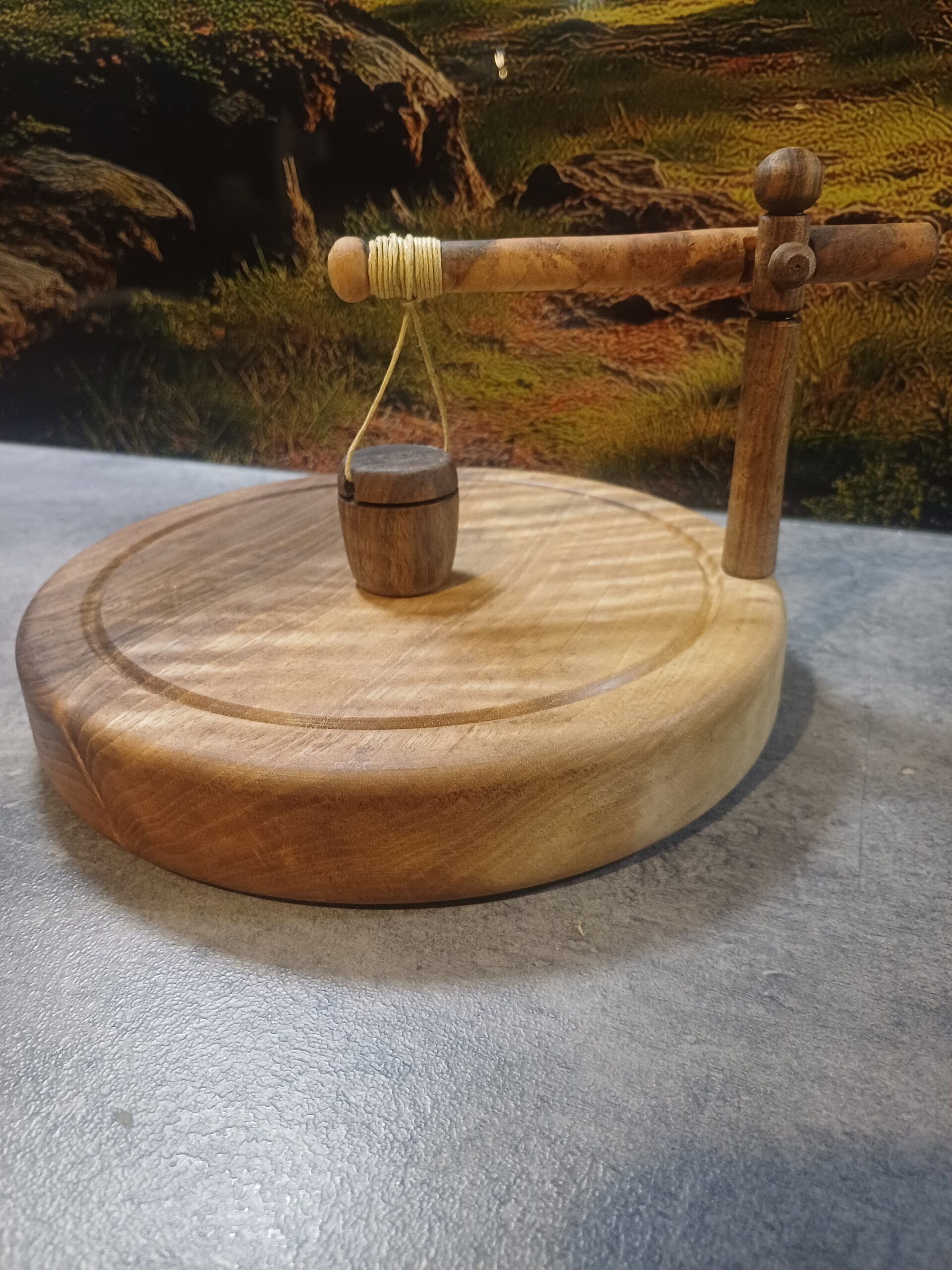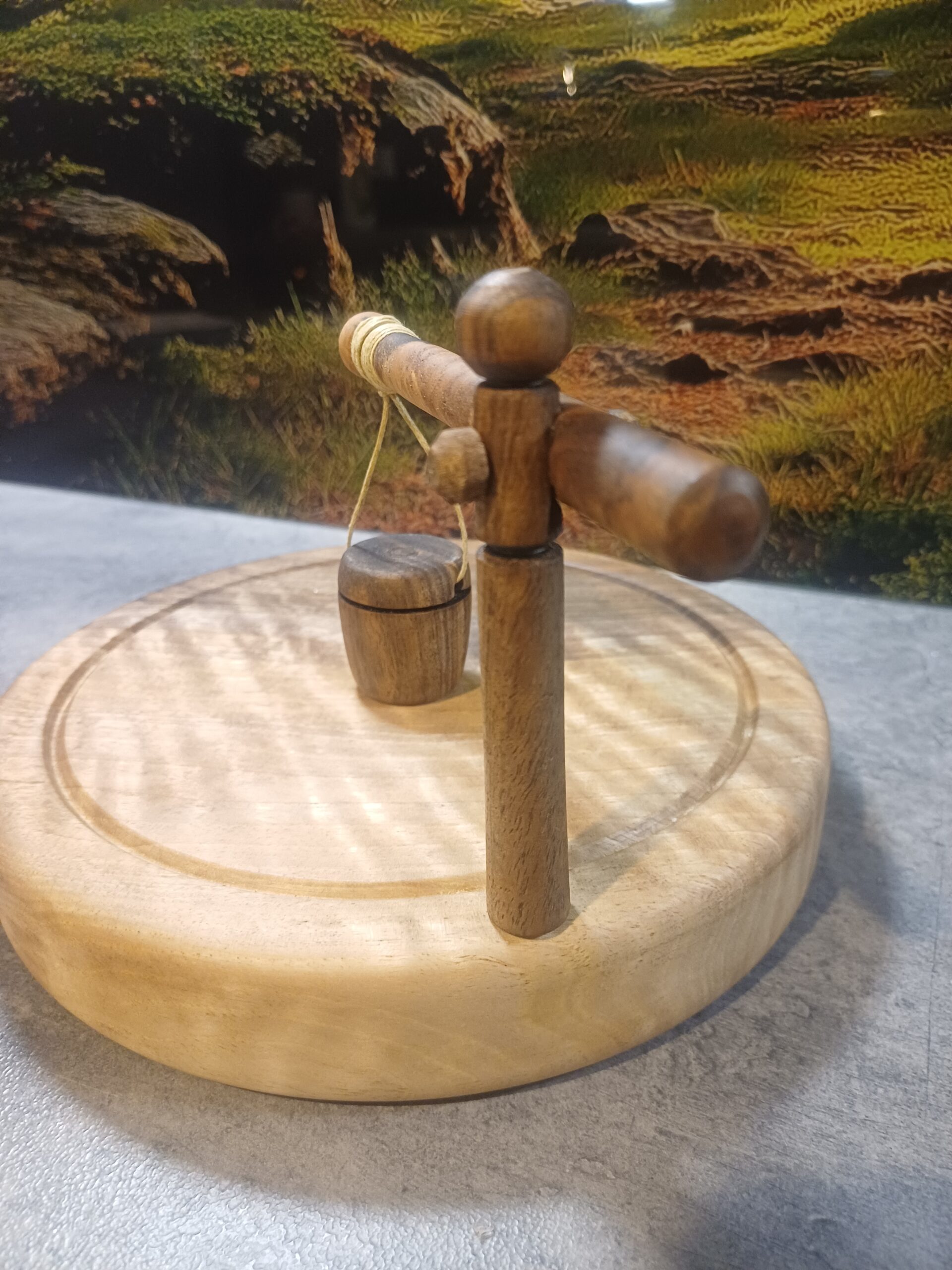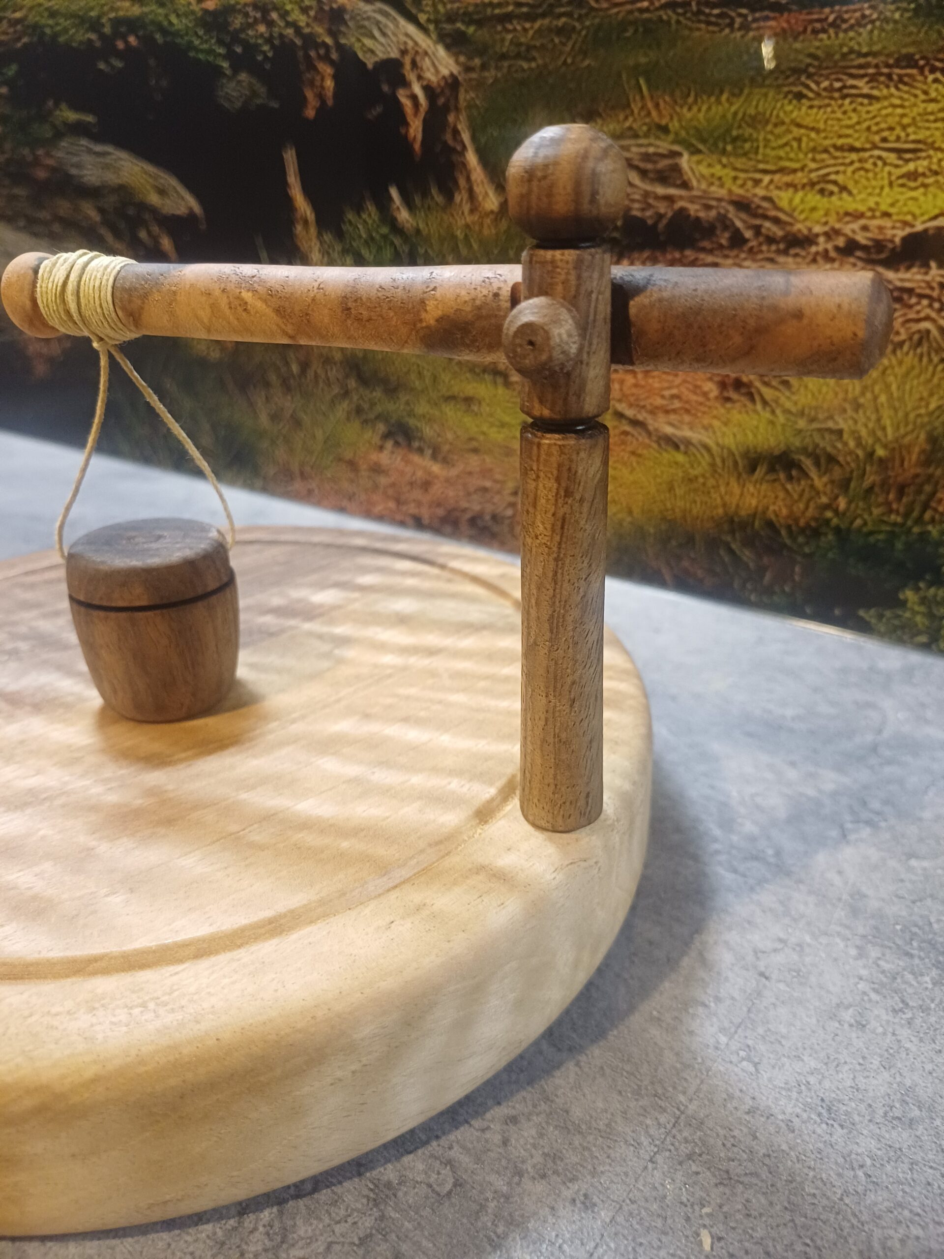 Stabilna podstawa oraz drewniany obciążnik na bawełnianym sznurku dociskają serwetki i zapobiegają ich unoszeniu.